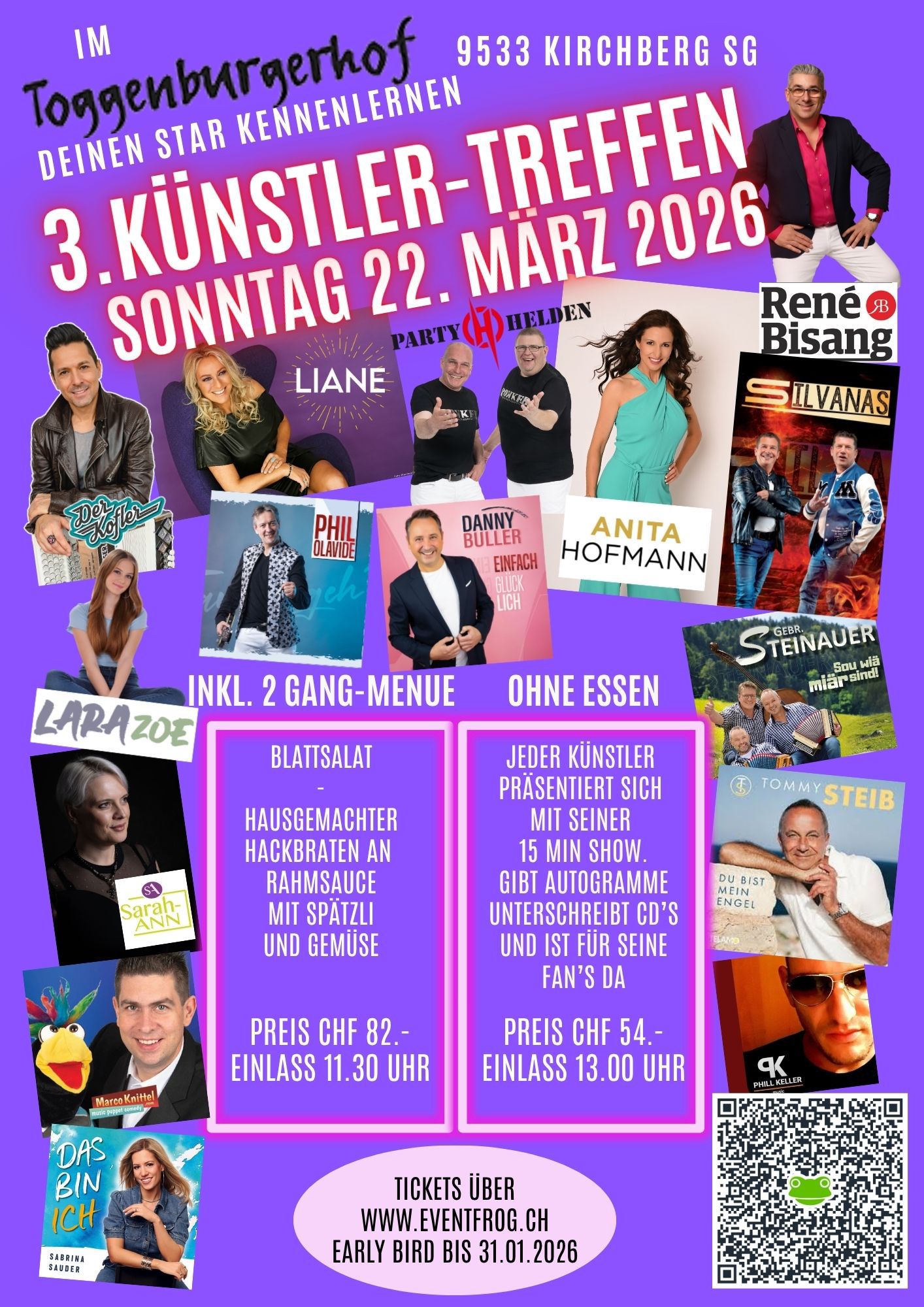 Liebe Freunde! Der Vorverkauf für das 3. Künstlertreffen vom So.22.03.2026 im Toggenburgerhof 9533 Kirchberg SG ist eröffnet!🎉 Profitiere von CHF 5.- Earlybird bis 31.01.2026!